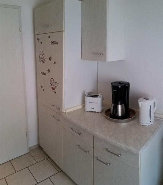 Die Küche ist voll ausgestattet und hat einen Backofen und einen Kühlschrank.